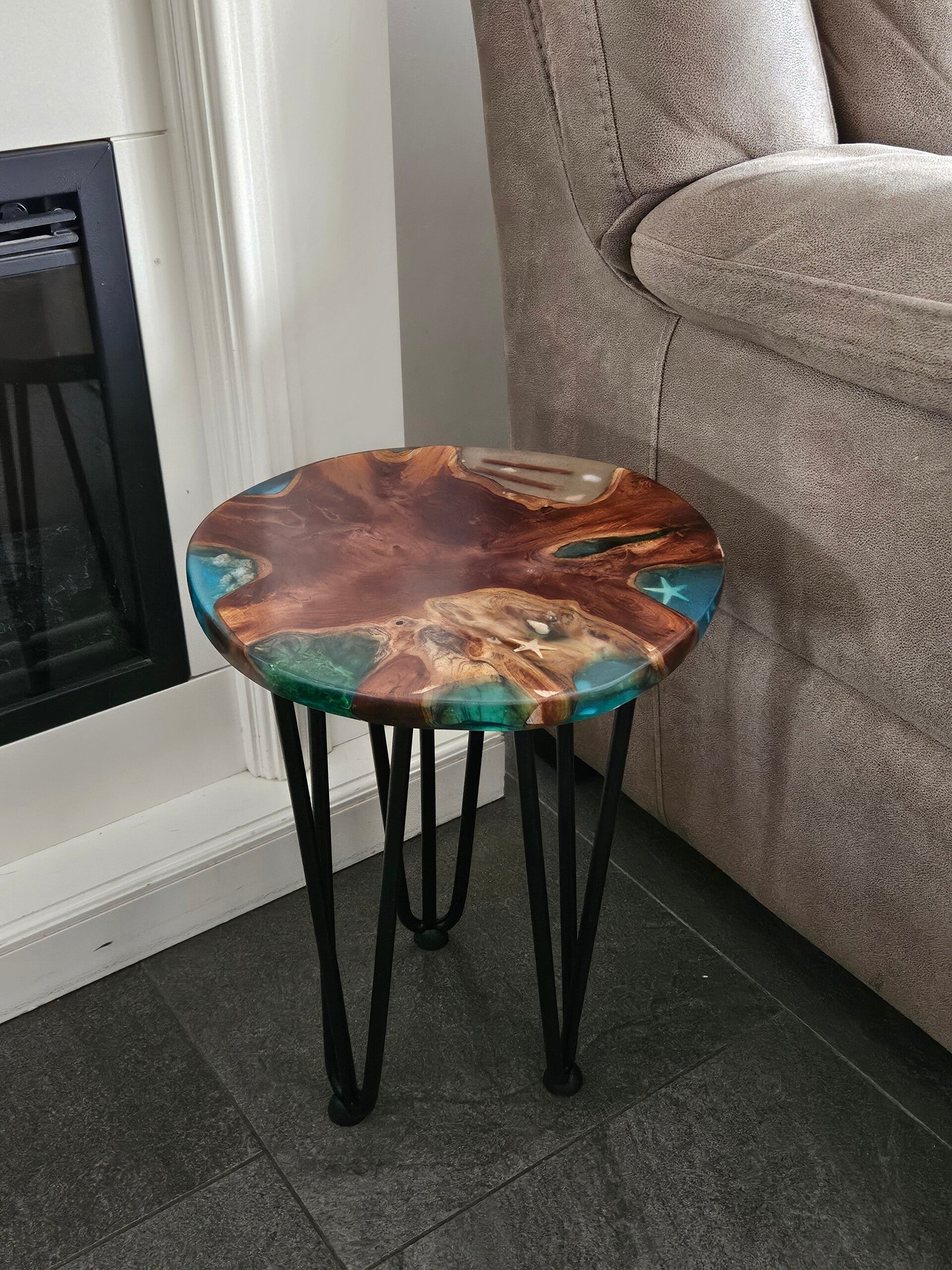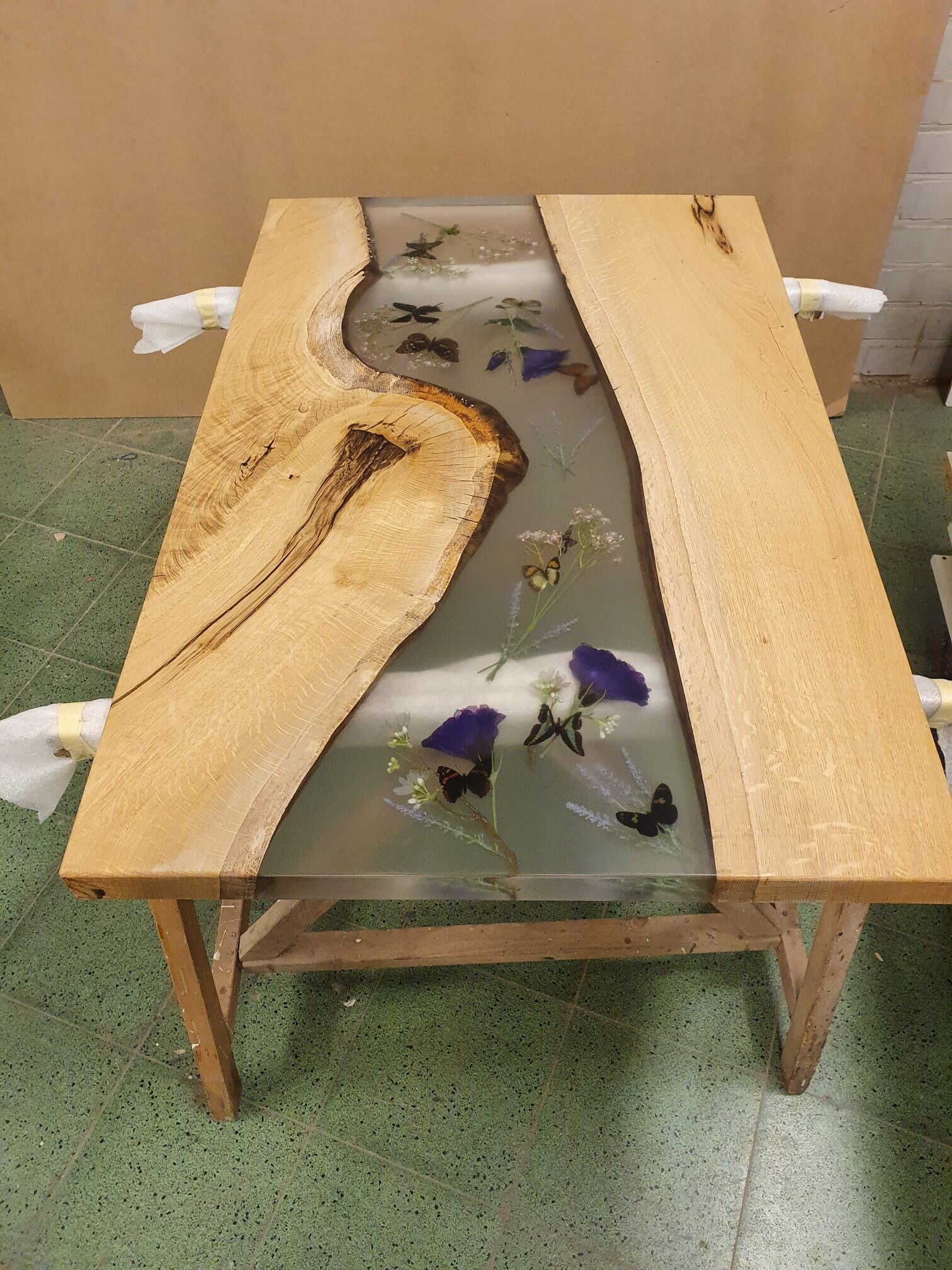 Tafel met vlinders, stenen, logo's, speelgoed, verschillende kleuren epoxy of bloemen